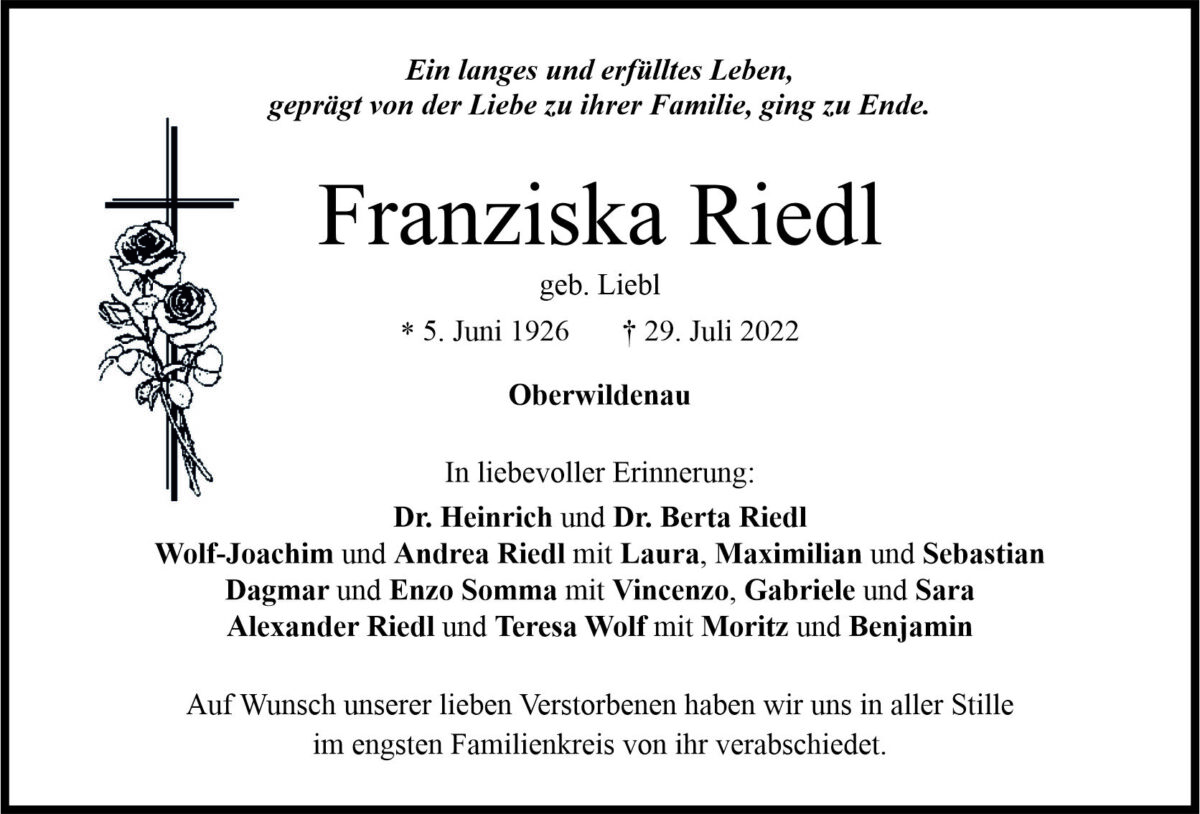 Traueranzeige Franziska Riedl, Oberwildenau 05. September 2022, 06:00 Uhr Von: redaktion Traueranzeige Franziska Riedl, Oberwildenau Landkreis Neustadt/WN Luhe-Wildenau