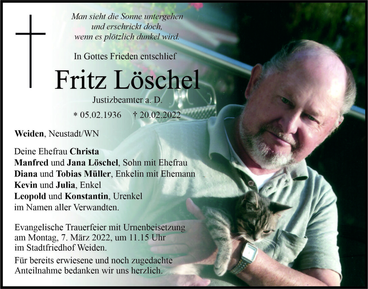 Traueranzeige Fritz Löschel, Weiden 03. März 2022, 06:00 Uhr Von: redaktion Traueranzeige Fritz Löschel, Weiden Landkreis Neustadt/WN Neustadt/WN Stadtgebiete Weiden Weiden Stadt