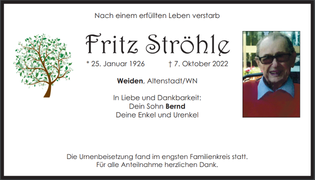 Traueranzeige Fritz Ströhle, Weiden 22. Oktober 2022, 06:00 Uhr Von: redaktion Traueranzeige Fritz Ströhle, Weiden Landkreis Neustadt/WN Altenstadt/WN Stadtgebiete Weiden Weiden Stadt