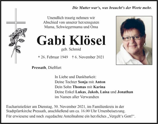 Traueranzeige Gabi Klösel, Pressath 26. November 2021, 06:00 Uhr Von: redaktion Traueranzeige Gabi Klösel, Pressath Landkreis Neustadt/WN Pressath