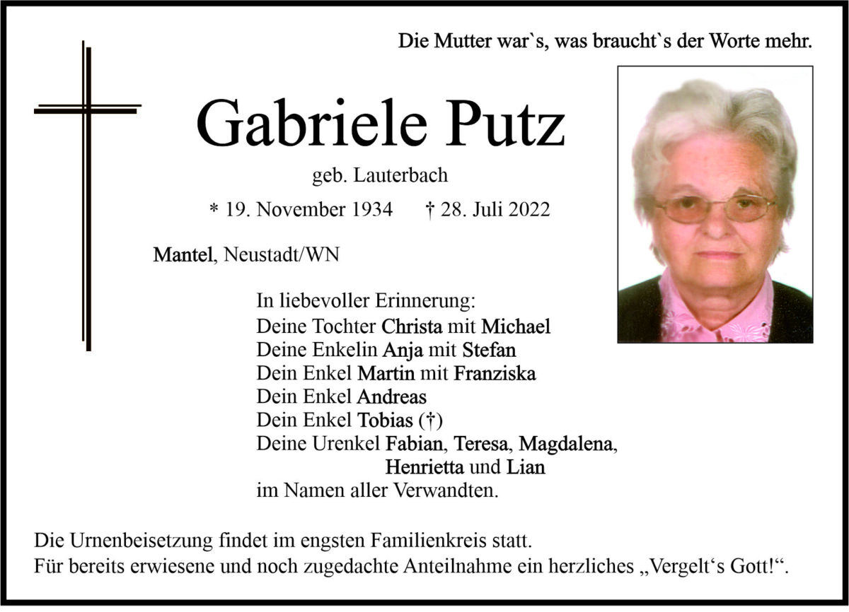 Traueranzeige Gabriele Putz, Mantel 02. August 2022, 06:00 Uhr Von: redaktion Traueranzeige Gabriele Putz, Mantel Landkreis Neustadt/WN Mantel Neustadt/WN