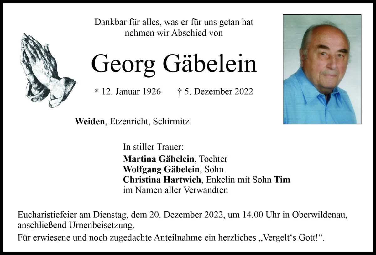 Traueranzeige Georg Gäbelein, Weiden 16. Dezember 2022, 06:00 Uhr Von: redaktion Traueranzeige Georg Gäbelein, Weiden Landkreis Neustadt/WN Etzenricht Schirmitz Stadtgebiete Weiden Weiden Stadt