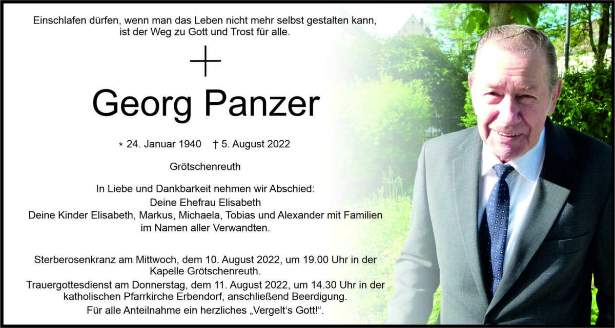 Traueranzeige Georg Panzer, Grötschenreuth 08. August 2022, 08:12 Uhr Von: redaktion Traueranzeige Georg Panzer, Grötschenreuth Landkreis Tirschenreuth Erbendorf