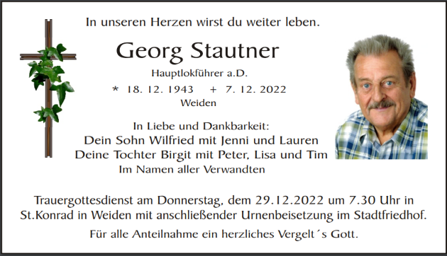 Traueranzeige Georg Stautner, Weiden 24. Dezember 2022, 06:00 Uhr Von: redaktion Traueranzeige Georg Stautner, Weiden Stadtgebiete Weiden Weiden Stadt