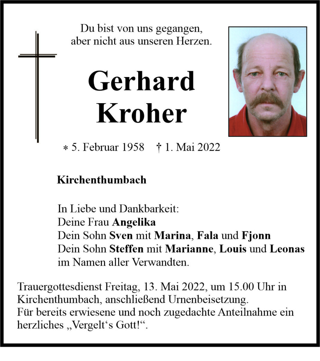 Traueranzeige Gerhard Kroher, Kirchenthumbach 11. Mai 2022, 06:00 Uhr Von: redaktion Traueranzeige Gerhard Kroher, Kirchenthumbach Landkreis Neustadt/WN Kirchenthumbach