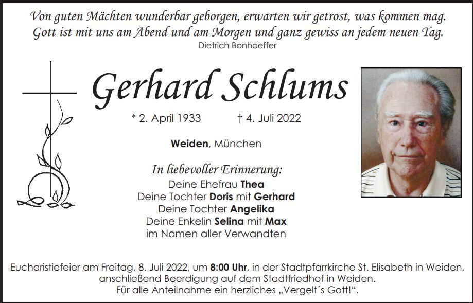Traueranzeige Gerhard Schlums, Weiden 07. Juli 2022, 06:00 Uhr Von: redaktion Traueranzeige Gerhard Schlums, Weiden Stadtgebiete Weiden Weiden Stadt