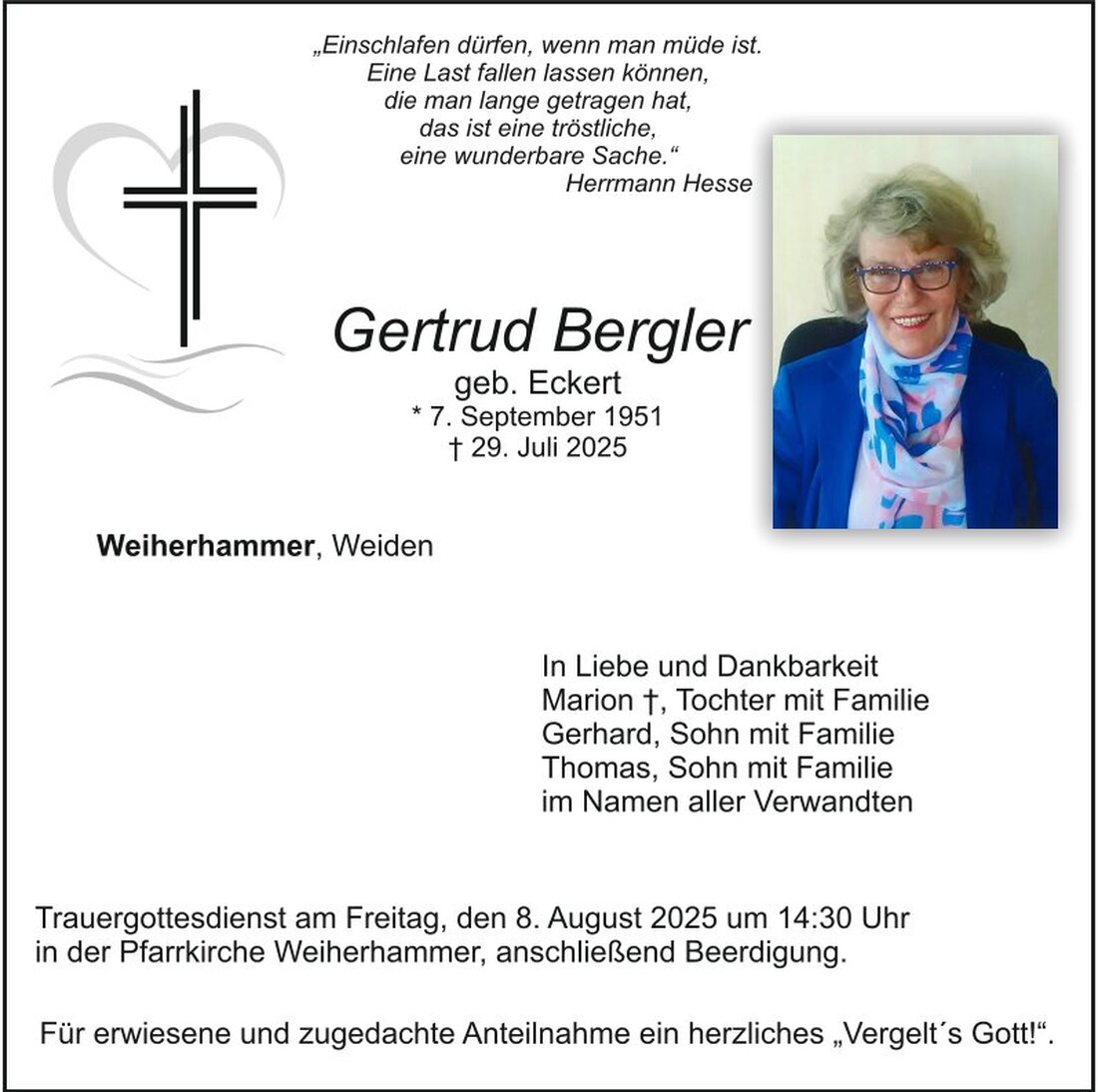 Traueranzeige Gertrud Bergler, Weiherhammer 01. August 2025, 17:04 Uhr Von: redaktion Traueranzeige Gertrud Bergler, Weiherhammer Landkreis Neustadt/WN Weiherhammer