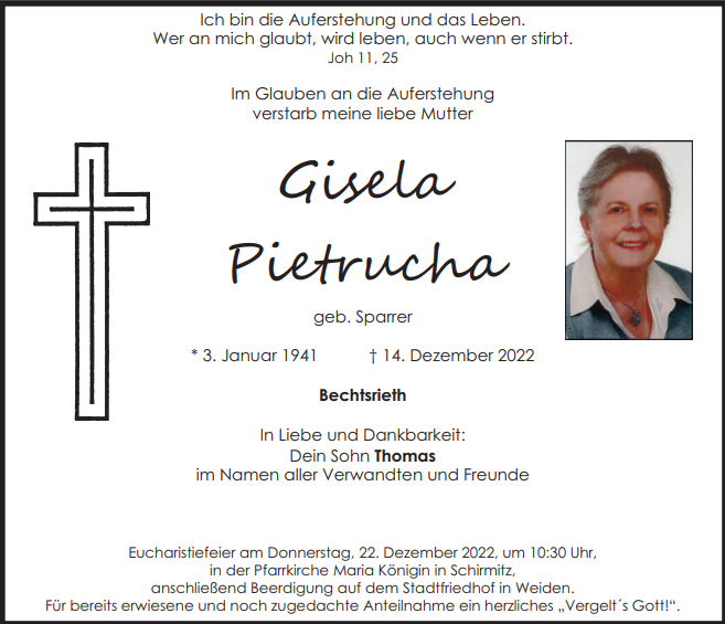 Traueranzeige Gisela Pietrucha, Bechtsrieth 17. Dezember 2022, 06:00 Uhr Von: redaktion Traueranzeige Gisela Pietrucha, Bechtsrieth Landkreis Neustadt/WN Bechtsrieth