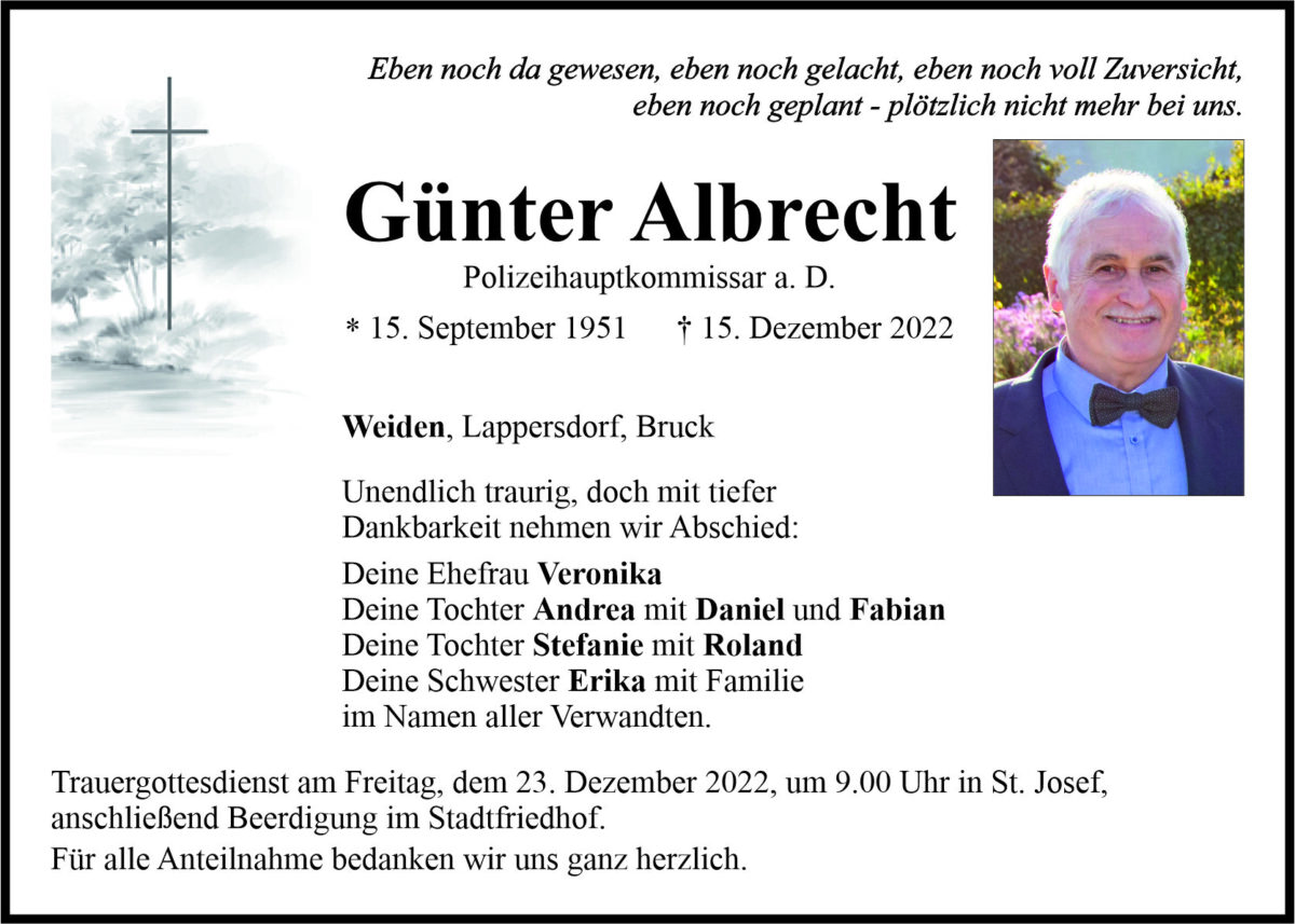 Traueranzeige Günter Albrecht, Weiden 22. Dezember 2022, 06:00 Uhr Von: redaktion Traueranzeige Günter Albrecht, Weiden Stadtgebiete Weiden Weiden Stadt
