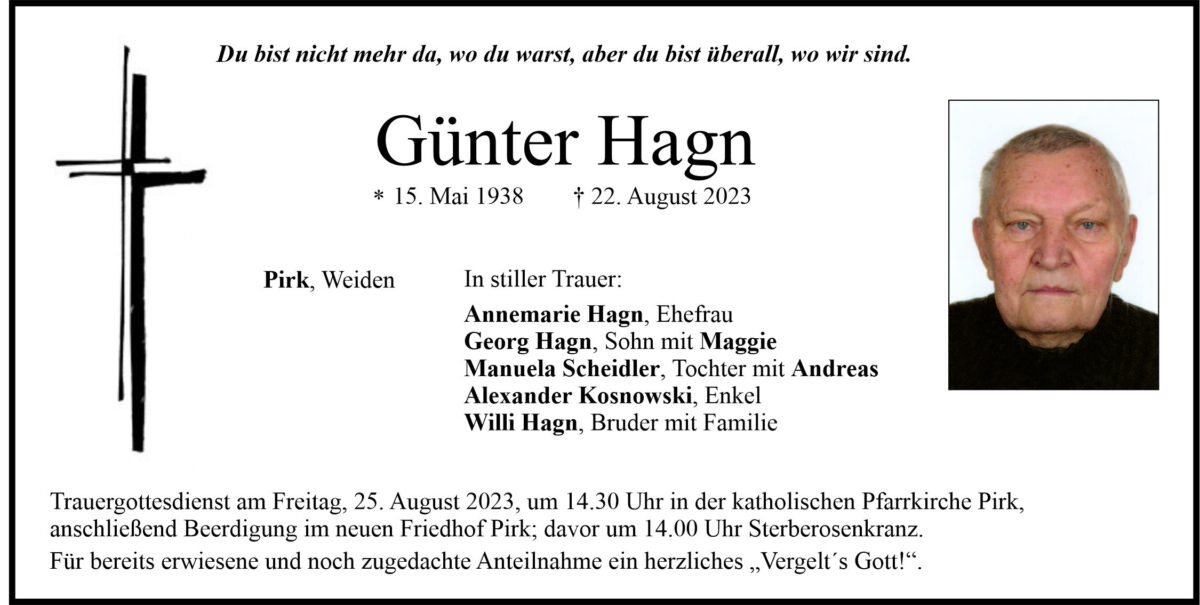 Traueranzeige Günter Hagn, Pirk 23. August 2023, 20:00 Uhr Von: redaktion Traueranzeige Günter Hagn, Pirk Landkreis Neustadt/WN Pirk Stadtgebiete Weiden Weiden Stadt
