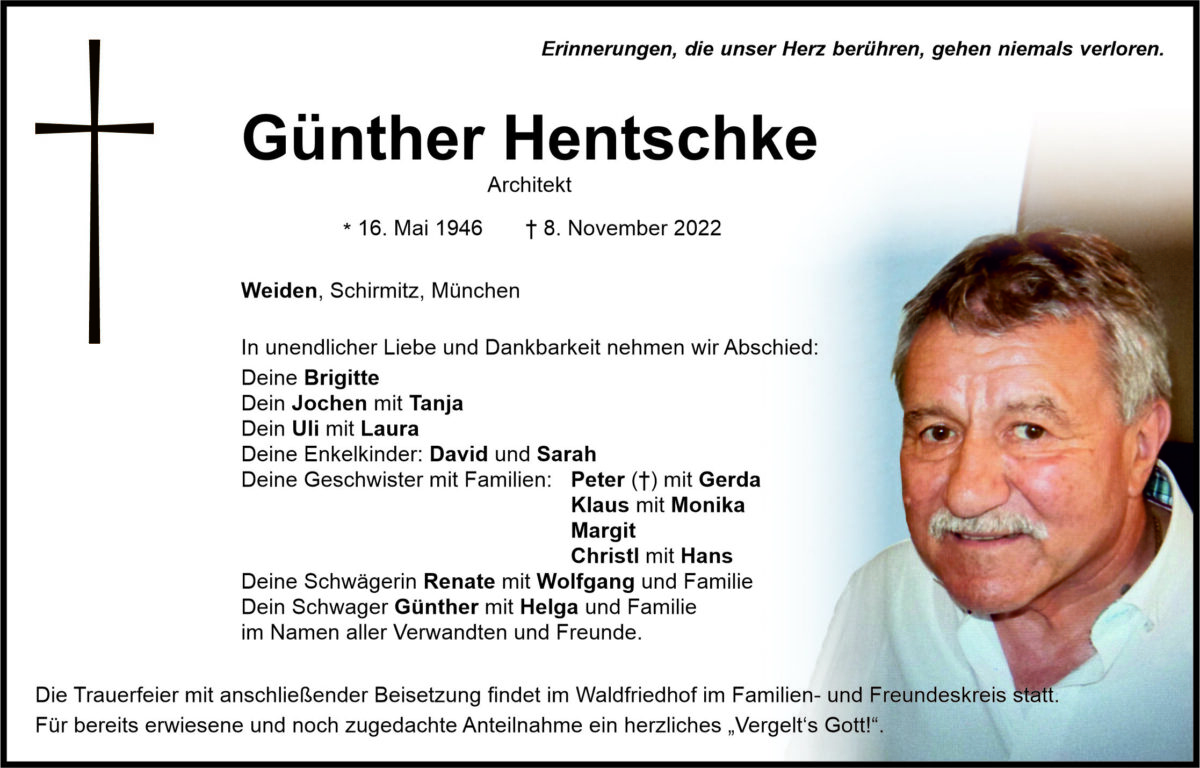 Traueranzeige Günther Hentschke, Weiden 12. November 2022, 06:00 Uhr Von: redaktion Traueranzeige Günther Hentschke, Weiden Landkreis Neustadt/WN Schirmitz Stadtgebiete Weiden Weiden Stadt