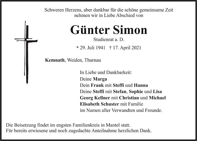 Traueranzeige Günter Simon, Kemnath 28. April 2021, 04:00 Uhr Von: redaktion Traueranzeige Günter Simon, Kemnath Landkreis Tirschenreuth Kemnath Stadtgebiete Weiden Weiden Stadt
