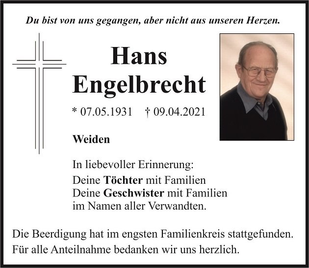 Traueranzeige Hans Engelbrecht, Weiden 15. April 2021, 04:00 Uhr Von: redaktion Traueranzeige Hans Engelbrecht, Weiden Stadtgebiete Weiden Weiden Stadt