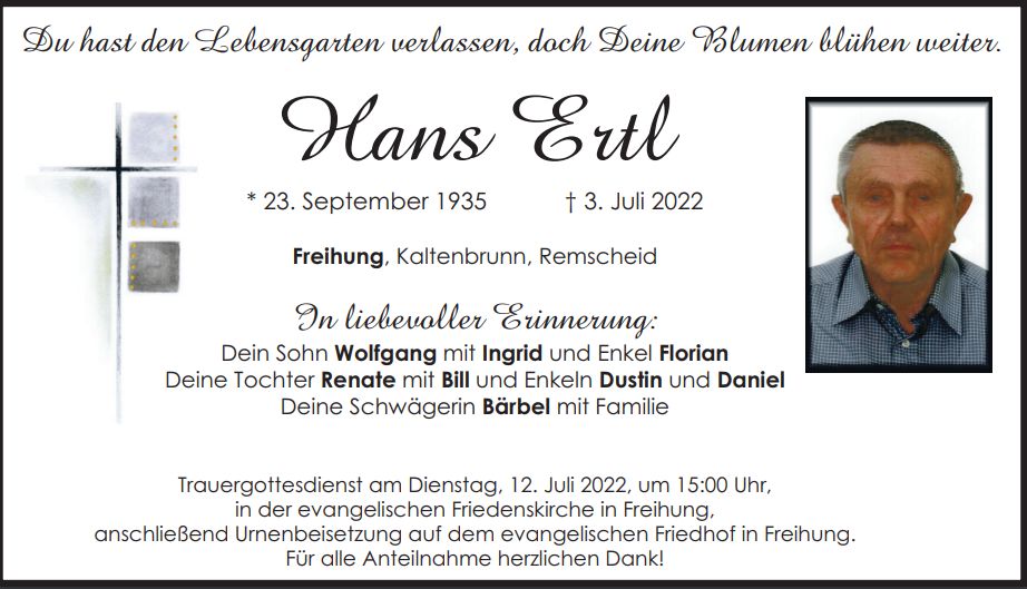 Traueranzeige Hans Ertl, Freihung 09. Juli 2022, 06:00 Uhr Von: redaktion Traueranzeige Hans Ertl, Freihung Landkreis Neustadt/WN Kaltenbrunn