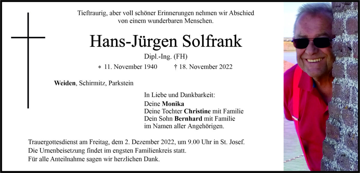 Traueranzeige Hans-Jürgen Solfrank, Weiden 29. November 2022, 06:00 Uhr Von: redaktion Traueranzeige Hans-Jürgen Solfrank, Weiden Landkreis Neustadt/WN Parkstein Schirmitz Stadtgebiete Weiden Weiden Stadt