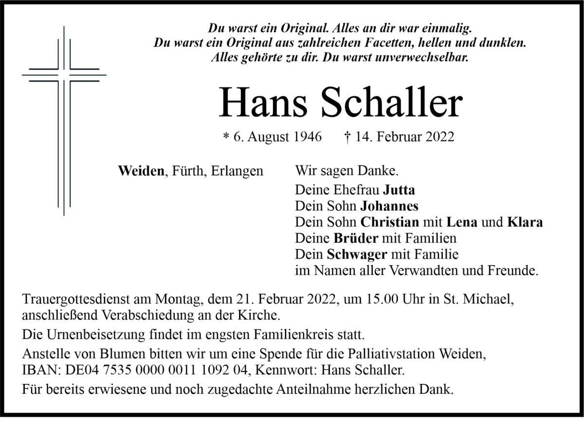 Traueranzeige Hans Schaller, Weiden 17. Februar 2022, 06:00 Uhr Von: redaktion Traueranzeige Hans Schaller, Weiden Stadtgebiete Weiden Weiden Stadt