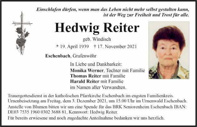 Traueranzeige Hedwig Reiter, Eschenbach 30. November 2021, 09:00 Uhr Von: redaktion Traueranzeige Hedwig Reiter, Eschenbach Landkreis Neustadt/WN Eschenbach