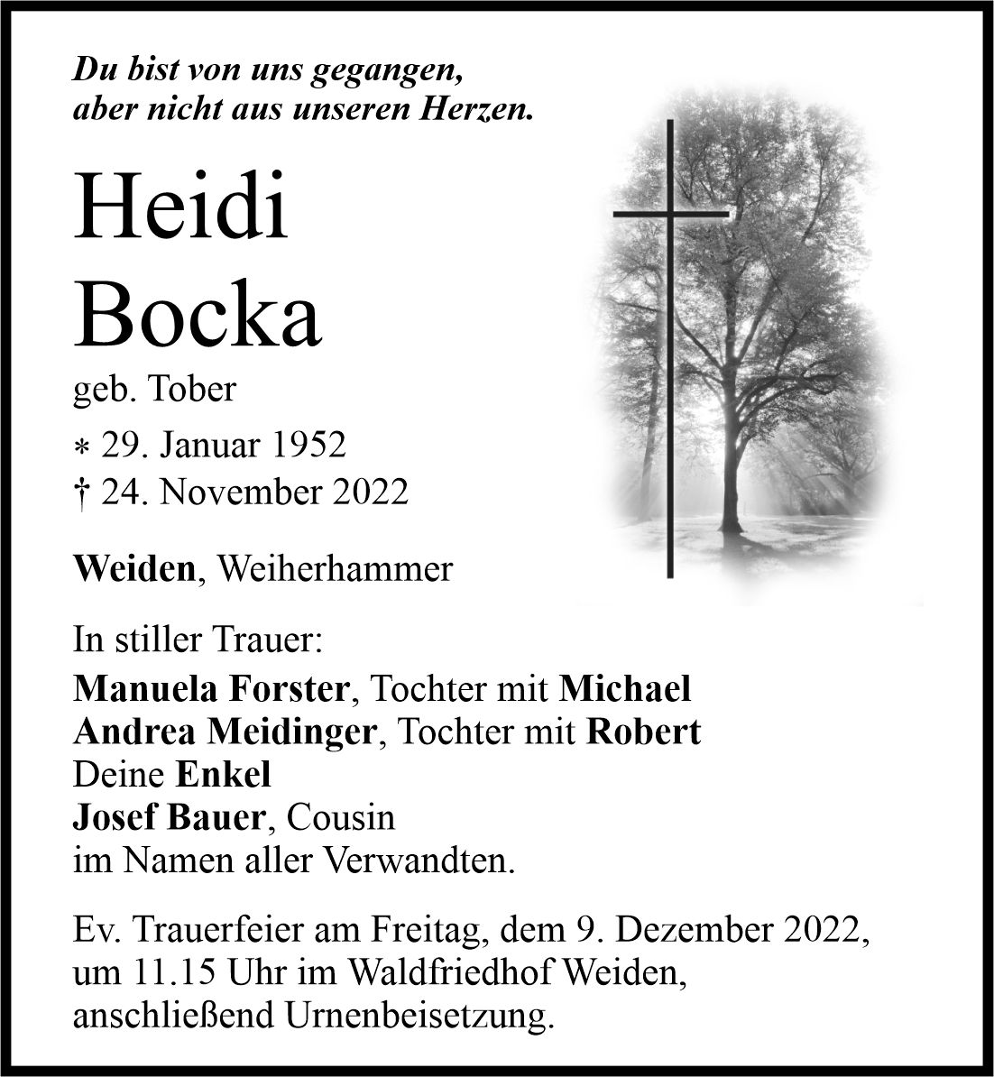 Traueranzeige Heidi Bocka, Weiden 06. Dezember 2022, 06:00 Uhr Von: redaktion Traueranzeige Heidi Bocka, Weiden Stadtgebiete Weiden Weiden Stadt Landkreis Neustadt/WN Weiherhammer