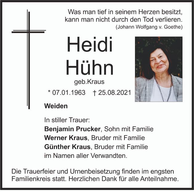 Traueranzeige Heidi Hühn, Weiden 31. August 2021, 04:00 Uhr Von: redaktion Traueranzeige Heidi Hühn, Weiden Stadtgebiete Weiden Weiden Stadt