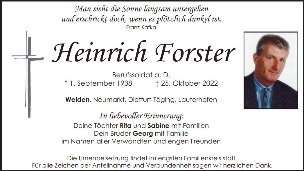 Traueranzeige Heinrich Forster, Weiden 29. Oktober 2022, 06:00 Uhr Von: redaktion Traueranzeige Heinrich Forster, Weiden Stadtgebiete Weiden Weiden Stadt
