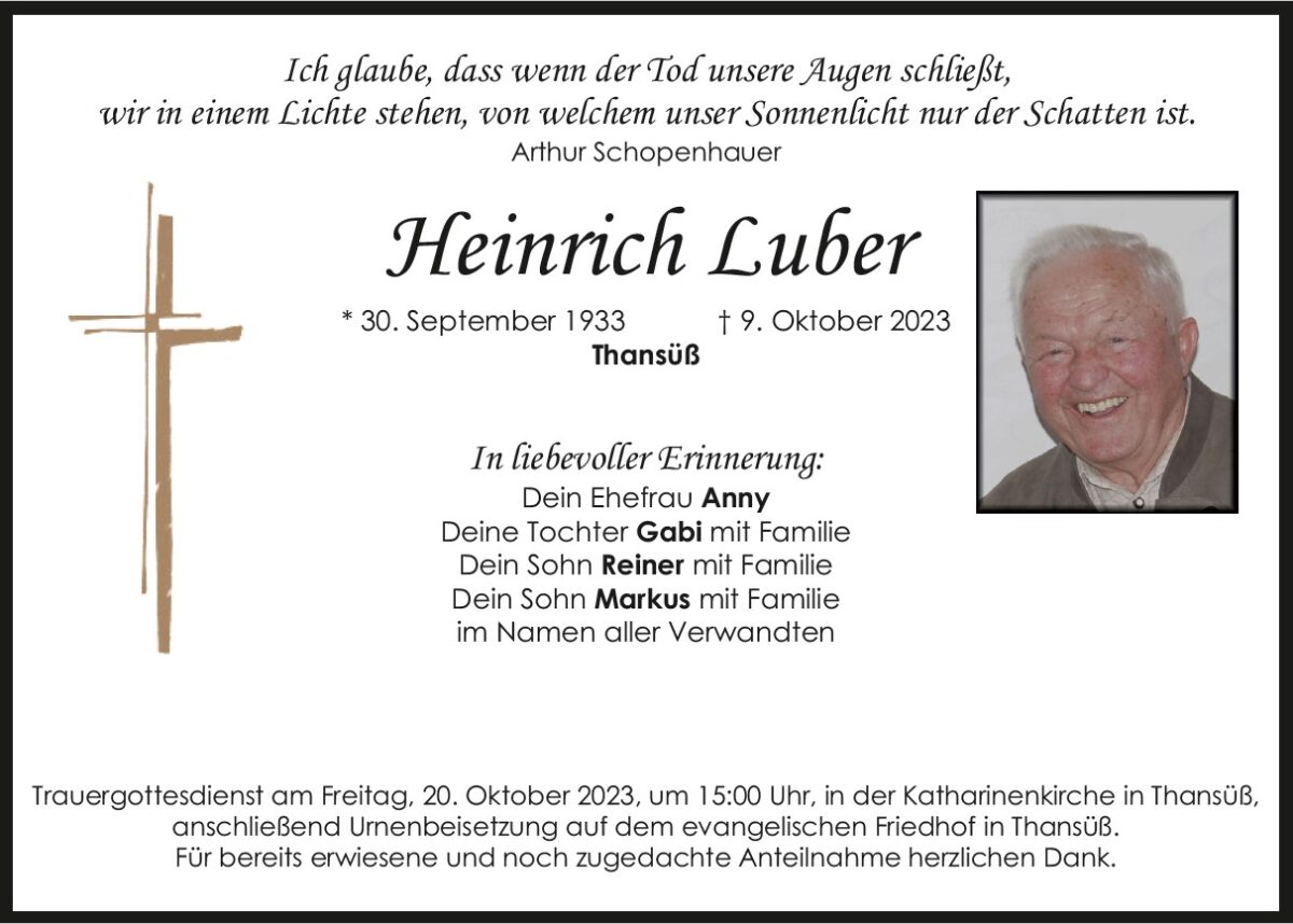 Traueranzeige Heinrich Luber, Thansüß 13. Oktober 2023, 20:00 Uhr Von: redaktion Traueranzeige Heinrich Luber, Thansüß Landkreis Neustadt/WN Kaltenbrunn