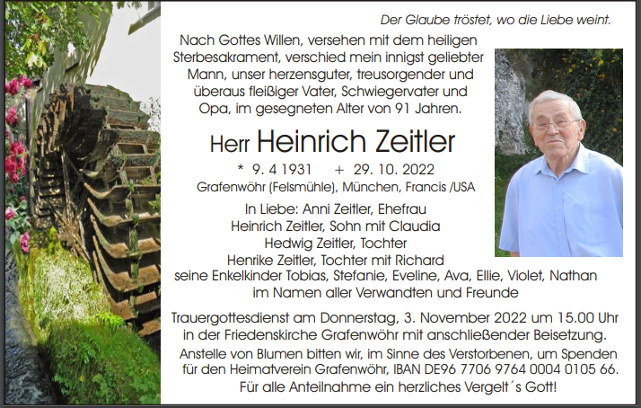Traueranzeige Heinrich Zeitler, Grafenwöhr 02. November 2022, 06:00 Uhr Von: redaktion Traueranzeige Heinrich Zeitler, Grafenwöhr Landkreis Neustadt/WN Grafenwöhr