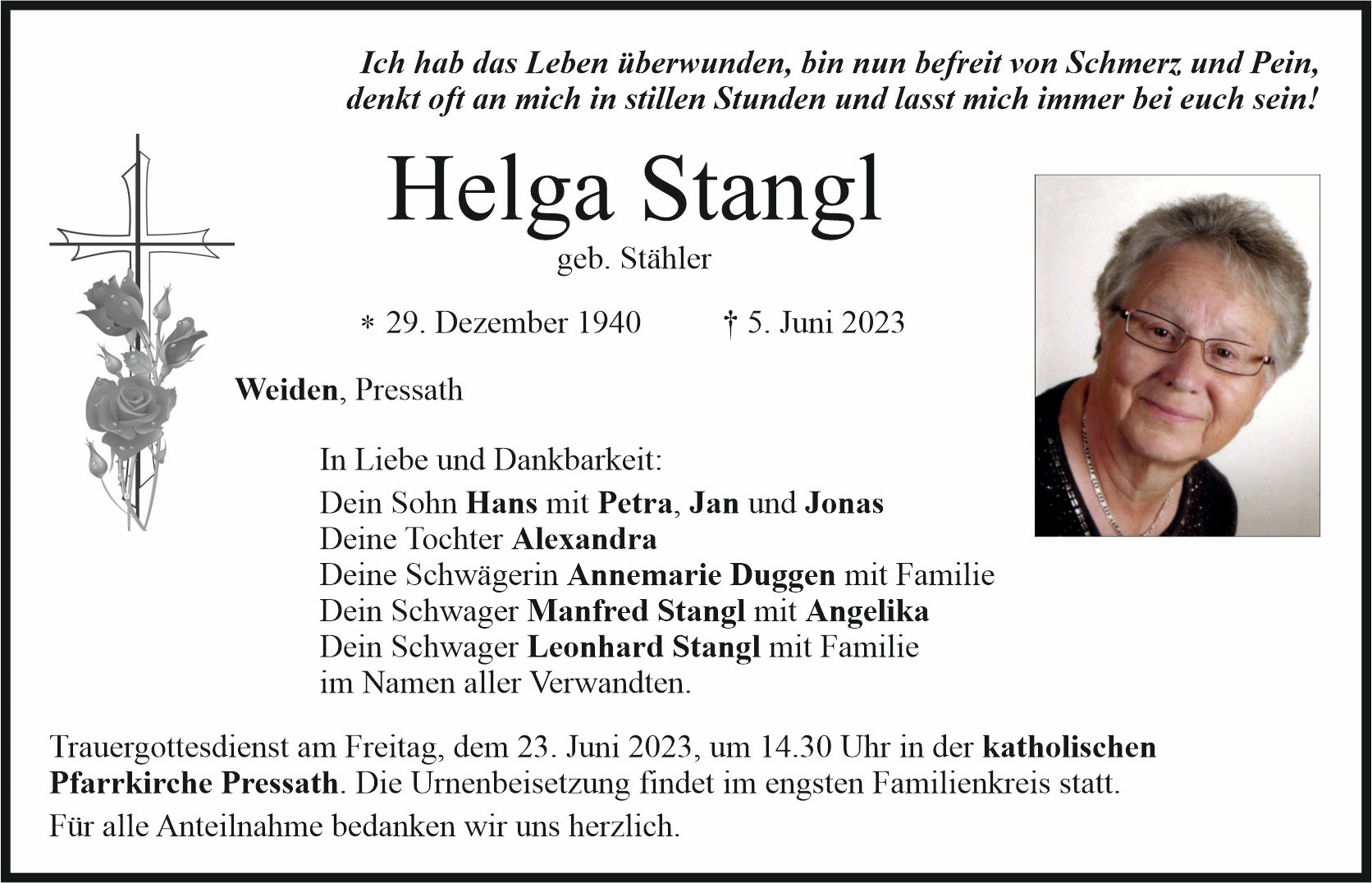 Traueranzeige Helga Stangl, Weiden 20. Juni 2023, 20:00 Uhr Von: redaktion Traueranzeige Helga Stangl, Weiden Landkreis Neustadt/WN Pressath Stadtgebiete Weiden Weiden Stadt