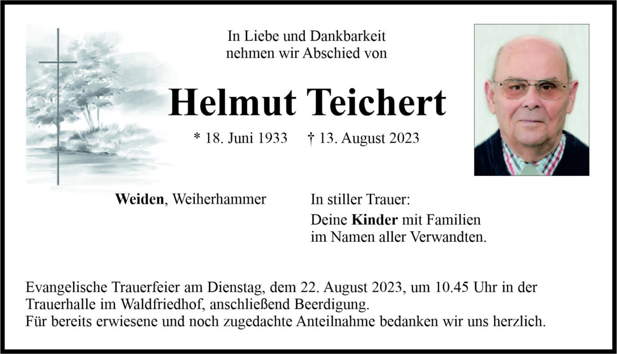 Traueranzeige Helmut Teichert, Weiden 18. August 2023, 20:00 Uhr Von: redaktion Traueranzeige Helmut Teichert, Weiden Stadtgebiete Weiden Weiden Stadt Landkreis Neustadt/WN Weiherhammer