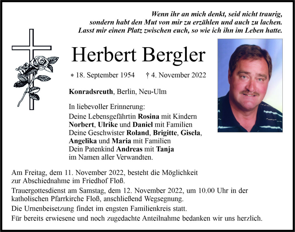 Traueranzeige Herbert Bergler, Konradsreuth 09. November 2022, 06:00 Uhr Von: redaktion Traueranzeige Herbert Bergler, Konradsreuth Landkreis Neustadt/WN Floß