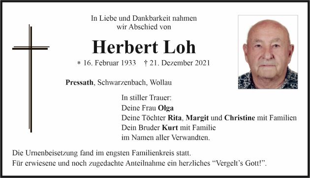 Traueranzeige Herbert Loh, Pressath 05. Januar 2022, 05:00 Uhr Von: redaktion Traueranzeige Herbert Loh, Pressath Landkreis Neustadt/WN Pressath