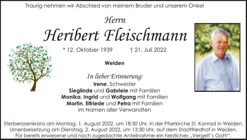 Traueranzeige Heribert Fleischmann, Weiden 30. Juli 2022, 06:00 Uhr Von: redaktion Traueranzeige Heribert Fleischmann, Weiden Stadtgebiete Weiden Weiden Stadt