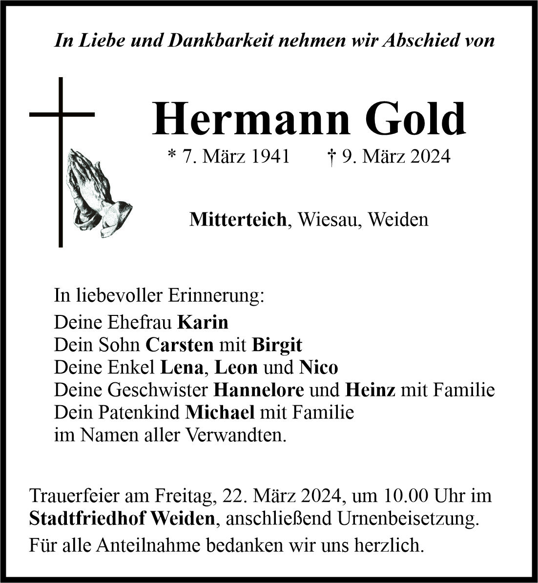 Traueranzeige Hermann Gold, Mitterteich 17. März 2024, 20:00 Uhr Von: redaktion Begleitet durch: Bestattung Bauer - Weiden Traueranzeige Hermann Gold, Mitterteich Landkreis Tirschenreuth Mitterteich Wiesau Stadtgebiete Weiden Weiden Stadt