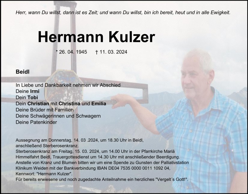 Traueranzeige Hermann Kulzer, Beidl 12. März 2024, 20:00 Uhr Von: redaktion Begleitet durch: Bestattung Schmid - Neustadt/WN Traueranzeige Hermann Kulzer, Beidl Landkreis Tirschenreuth Plößberg