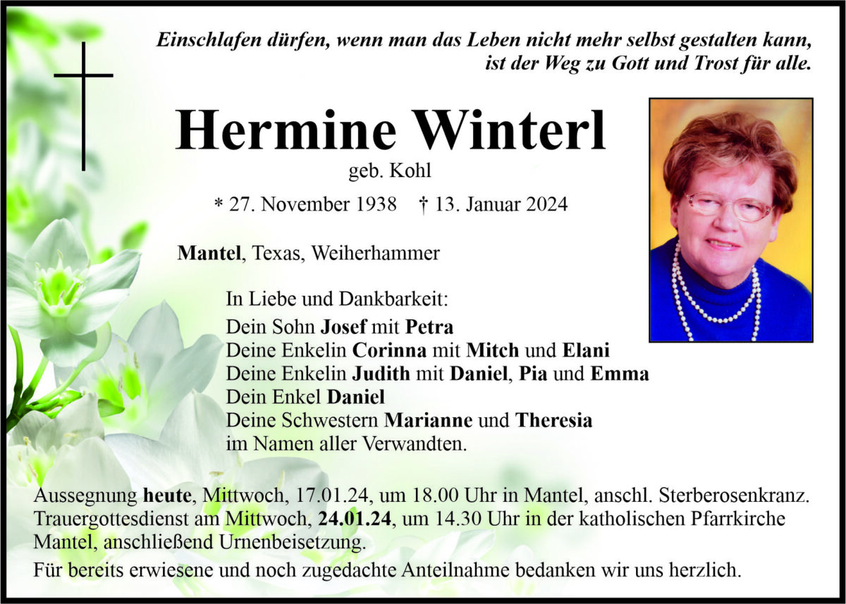 Traueranzeige Hermine Winterl, Mantel 16. Januar 2024, 20:00 Uhr Von: redaktion Traueranzeige Hermine Winterl, Mantel Landkreis Neustadt/WN Mantel Weiherhammer