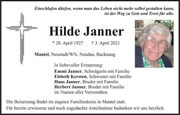 Traueranzeige Hilde Janner, Mantel 10. April 2021, 04:00 Uhr Von: redaktion Traueranzeige Hilde Janner, Mantel Landkreis Neustadt/WN Mantel Neustadt/WN