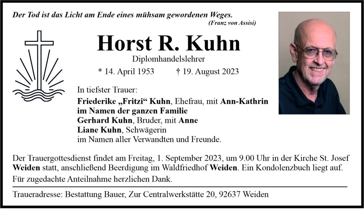 Traueranzeige Horst R. Kuhn, Weiden 25. August 2023, 20:00 Uhr Von: redaktion Traueranzeige Horst R. Kuhn, Weiden Stadtgebiete Weiden Weiden Stadt