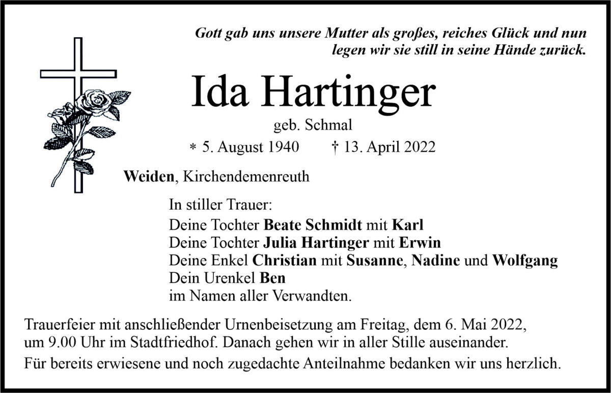 Traueranzeige Ida Hartinger, Weiden 03. Mai 2022, 06:00 Uhr Von: redaktion Traueranzeige Ida Hartinger, Weiden Landkreis Neustadt/WN Kirchendemenreuth Stadtgebiete Weiden Weiden Stadt