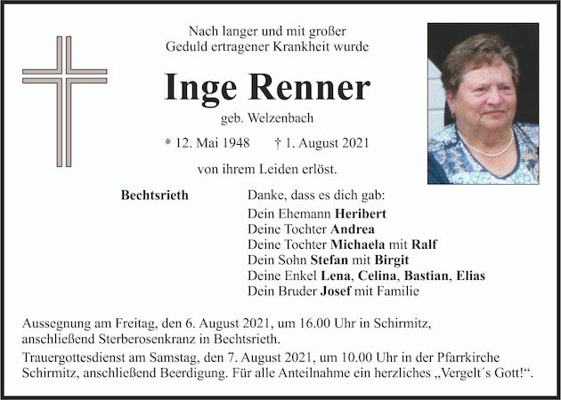 Traueranzeige Inge Renner, Bechtsrieth 04. August 2021, 04:00 Uhr Von: redaktion Traueranzeige Inge Renner, Bechtsrieth Landkreis Neustadt/WN Bechtsrieth