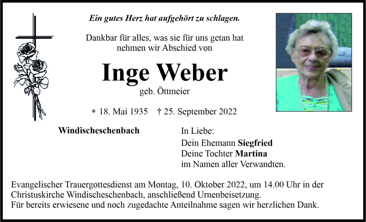 Traueranzeige Inge Weber, Windischeschenbach 06. Oktober 2022, 06:00 Uhr Von: redaktion Traueranzeige Inge Weber, Windischeschenbach Landkreis Neustadt/WN Windischeschenbach