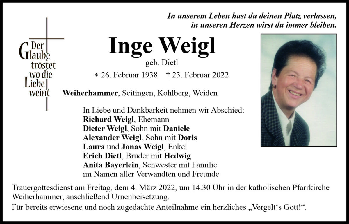 Traueranzeige Inge Weigl, Weiherhammer 02. März 2022, 06:00 Uhr Von: redaktion Traueranzeige Inge Weigl, Weiherhammer Landkreis Neustadt/WN Kohlberg Weiherhammer Stadtgebiete Weiden Weiden Stadt