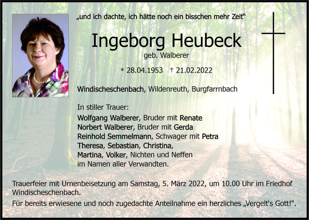 Traueranzeige Ingeborg Heubeck, Windischeschenbach 02. März 2022, 06:00 Uhr Von: redaktion Traueranzeige Ingeborg Heubeck, Windischeschenbach Landkreis Neustadt/WN Windischeschenbach