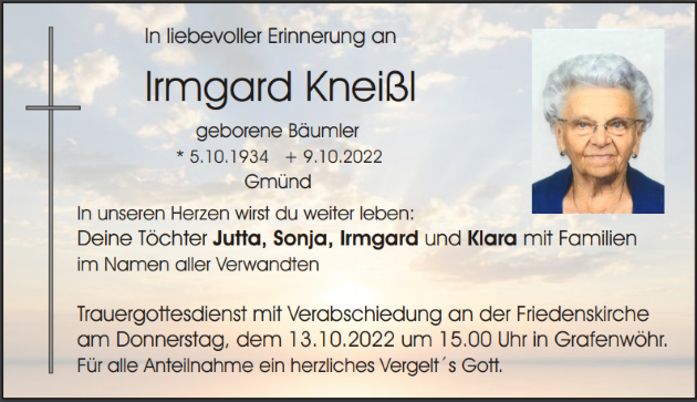 Traueranzeige Irmgard Kneißl, Gmünd 11. Oktober 2022, 06:00 Uhr Von: redaktion Traueranzeige Irmgard Kneißl, Gmünd Landkreis Neustadt/WN Grafenwöhr