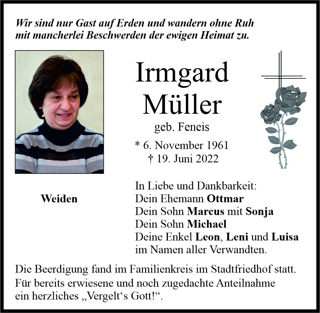 Traueranzeige Irmgard Müller, Weiden 25. Juni 2022, 06:00 Uhr Von: redaktion Traueranzeige Irmgard Müller, Weiden Stadtgebiete Weiden Weiden Stadt