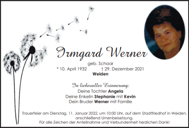 Traueranzeige Irmgard Werner, Weiden 08. Januar 2022, 05:00 Uhr Von: redaktion Traueranzeige Irmgard Werner, Weiden Stadtgebiete Weiden Weiden Stadt