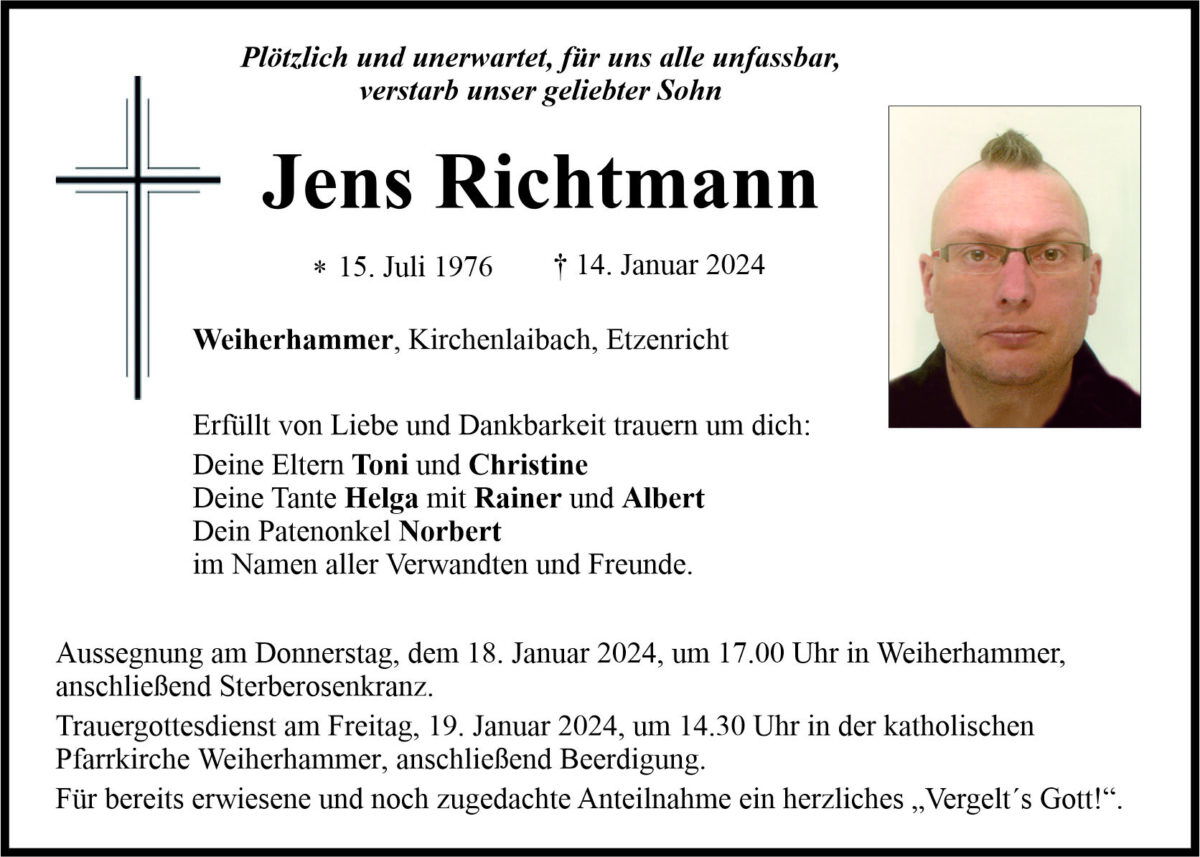 Traueranzeige Jens Richtmann, Weiherhammer 16. Januar 2024, 20:00 Uhr Von: redaktion Traueranzeige Jens Richtmann, Weiherhammer Landkreis Neustadt/WN Etzenricht Weiherhammer