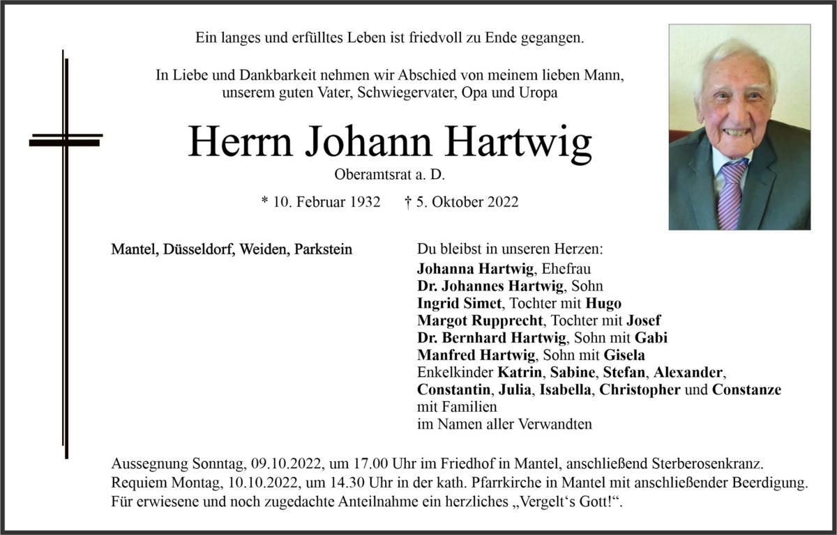 Traueranzeige Johann Hartwig, Mantel 08. Oktober 2022, 06:00 Uhr Von: redaktion Traueranzeige Johann Hartwig, Mantel Landkreis Neustadt/WN Mantel Parkstein Stadtgebiete Weiden Weiden Stadt