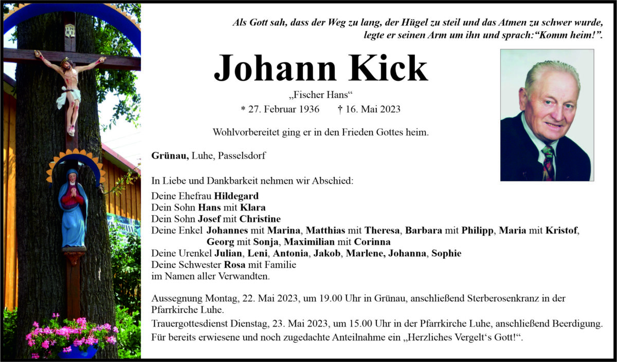 Traueranzeige Johann Kick, Grünau 19. Mai 2023, 20:00 Uhr Von: redaktion Traueranzeige Johann Kick, Grünau Landkreis Neustadt/WN Luhe-Wildenau