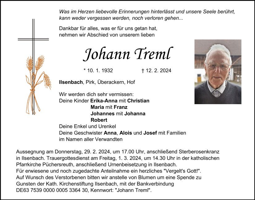 Traueranzeige Johann Treml, Ilsenbach 23. Februar 2024, 20:00 Uhr Von: redaktion Traueranzeige Johann Treml, Ilsenbach Landkreis Neustadt/WN Pirk
