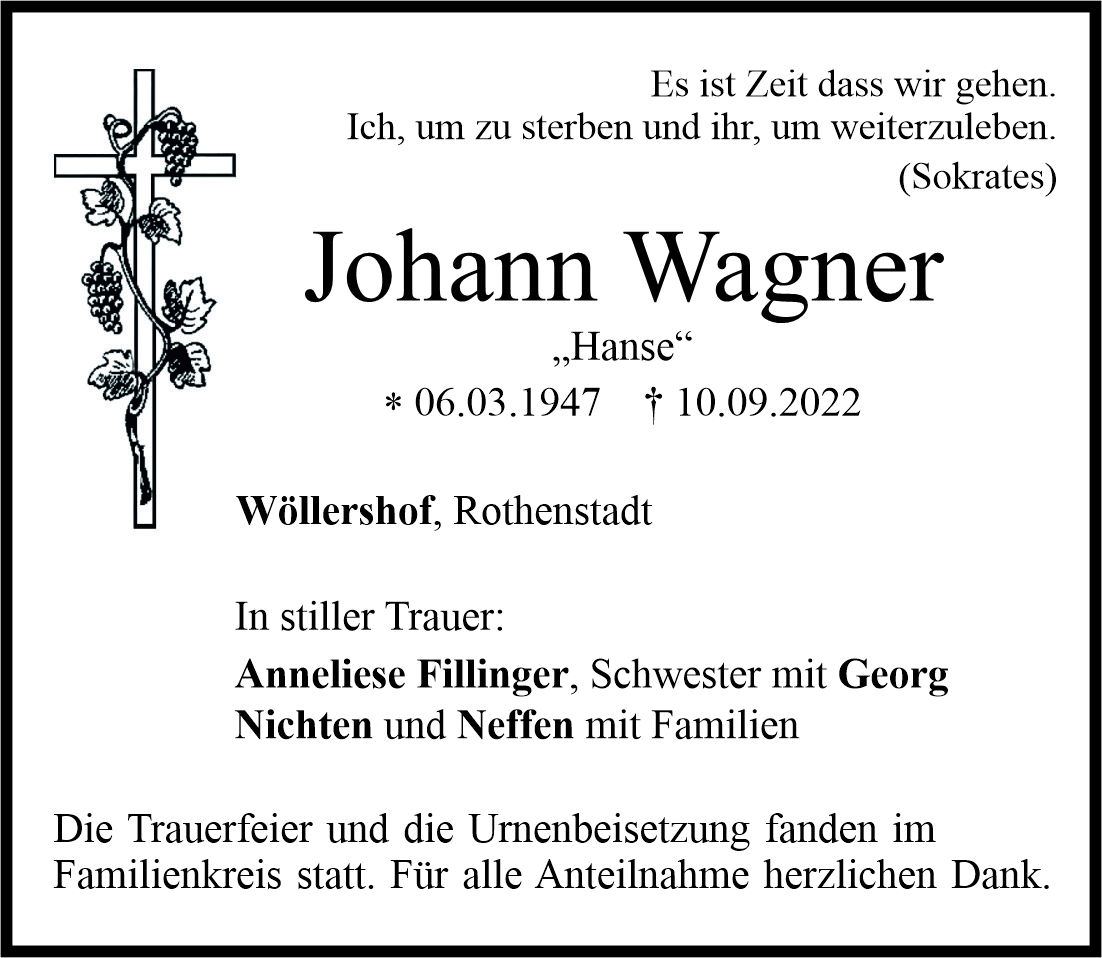 Traueranzeige Johann Wagner, Wöllershof 22. September 2022, 06:00 Uhr Von: redaktion Traueranzeige Johann Wagner, Wöllershof Stadtgebiete Weiden Rothenstadt