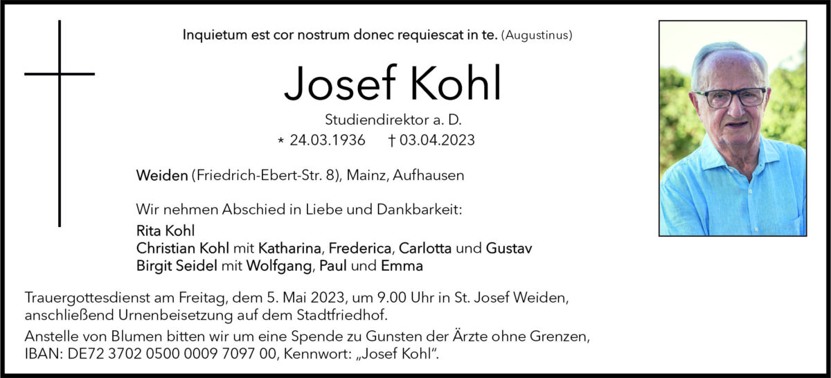Traueranzeige Josef Kohl, Weiden 14. April 2023, 20:00 Uhr Von: redaktion Traueranzeige Josef Kohl, Weiden Stadtgebiete Weiden Weiden Stadt